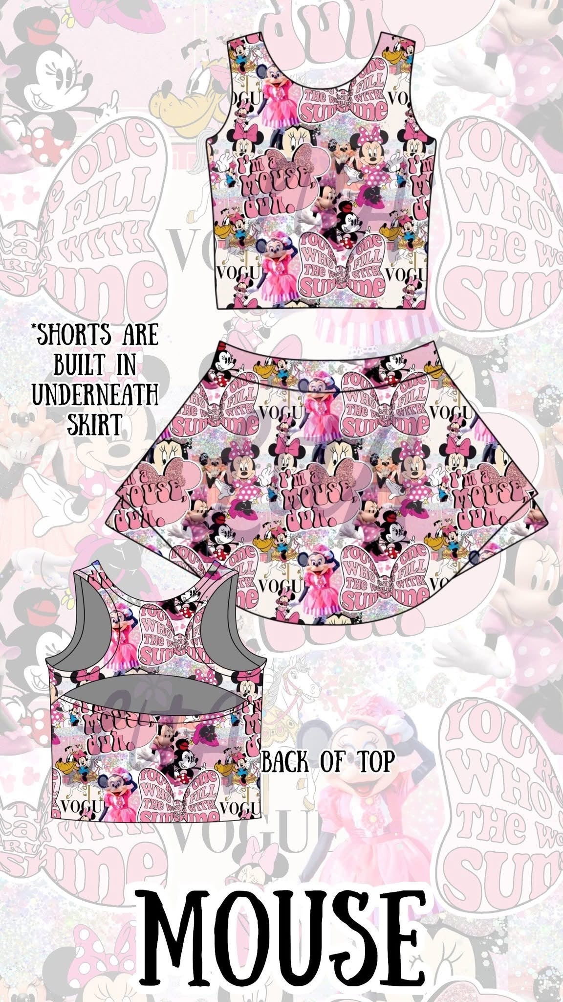 PRE-ORDER MOUSE 2 PIECE SKORT SET** TURN AROUND TIME OF 8/10 WEEKS FROM CLOSING DATE OF 3/2